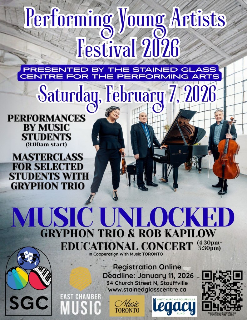 Proudly presenting the Performing Young Artists Festival 2026, by the Stained Glass Centre for the Performing Arts at Stouffville United Church, featuring the Gryphon Trio.
